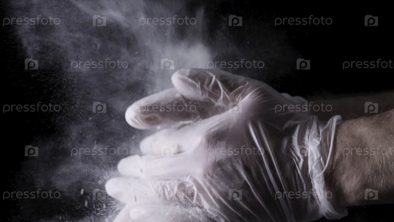Руки шеф-повара бьют муку в замедленном режиме на черном фоне. Рамка. Шеф-повар бьет руки вместе с мукой, супермедленное движение