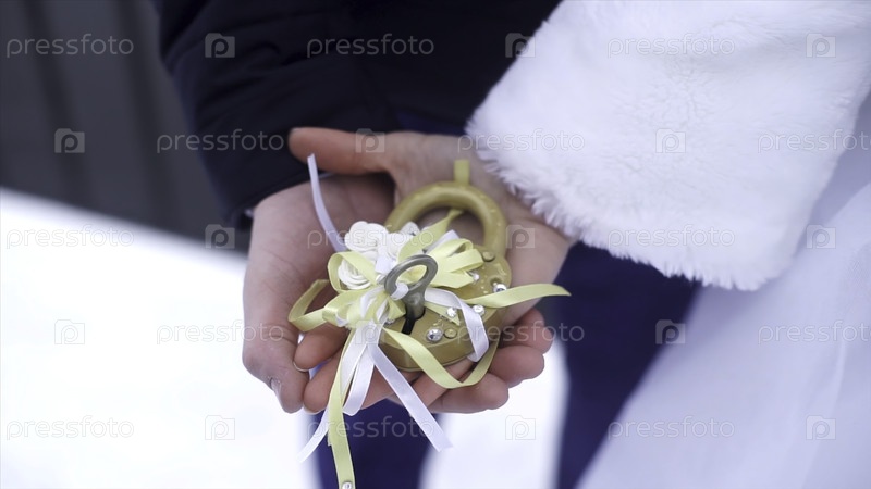 Символ свадьбы, замок в руках невесты и жениха. молодожены фиксируют замок на мосту как символ любви. замк в руках невесты и жениха. сердечно-образный замок на перилке моста является символом счастливой жизни