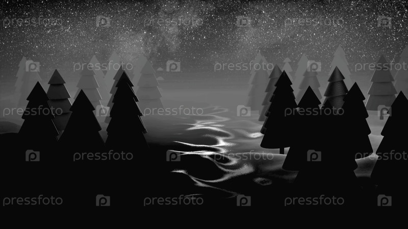 Монохромная абстракция исчезающих темных силуэтов хвойных деревьев на фоне ночного неба и миллиардов светящихся звезд