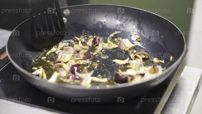 Жареный лук в масле на сковороде. Вегетарианский жареное блюдо. Здоровое питание. Вид сверху. Вид сверху, чтобы жарить овощи в ваке, на плите