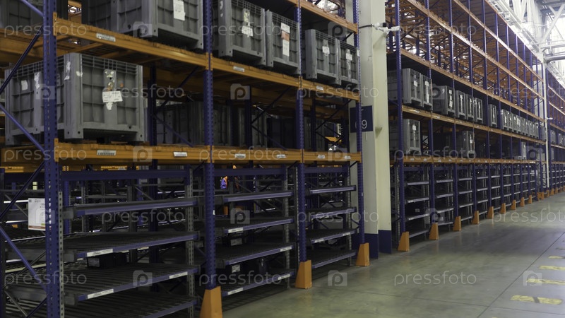 Большой и просторный склад со многими пластиковыми коробками на полках. Логистика, хранение, доставка, промышленность и концепция производства