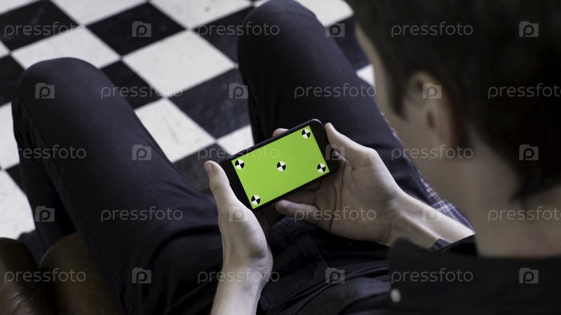 Бизнесмен использует смартфон с зеленым экраном, сидя на диване на черепичном черно-белом фоне пола. Резервные кадры. Человек держит устройство в горизонтальном положении и наблюдает