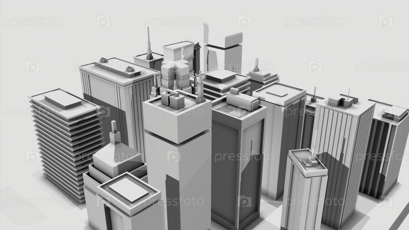 Абстрактная анимация 3D архитектурной модели большого современного центра города на белом фоне. Анимация. Простая 3D-анимация в 4K