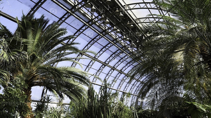 Красивый зеленый арборет в парке с большими стеклянными окнами и различными растениями. теплица с кактусами, пальмами и другой зелени на голубом фоне неба
