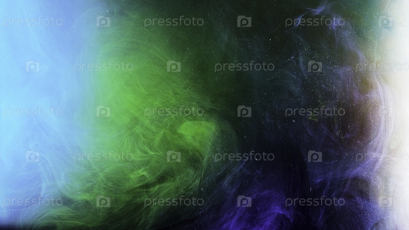 Удивительный эффект смешанных синих и зеленых жидких красок с крошечными частицами, акварельная живопись