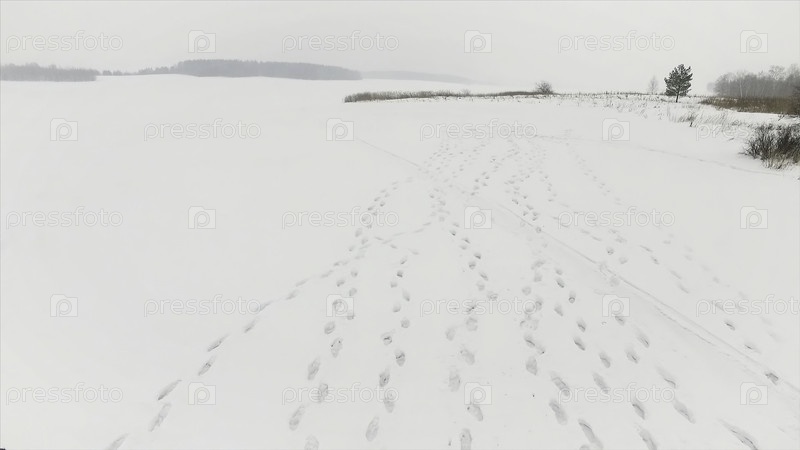 Следы в снегу. Кадр. Вид сверху на три следа в ледяном снеге в солнечный день
