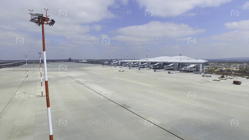 Вид из воздуха на современный терминал международного аэропорта. Путешествие по всему миру. Пустой аэропорт. Вид на взлетно-посадочную полосу в аэропорту. Маркировка аэродрома на подъездной дороге направлена к 4K взлетной полосе