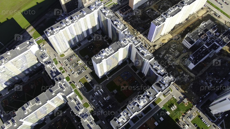 Жилые многоэтажные здания с строящимися комплексами. Движение. Верхний вид видимого контраста близлежащей построенной и населенной местности