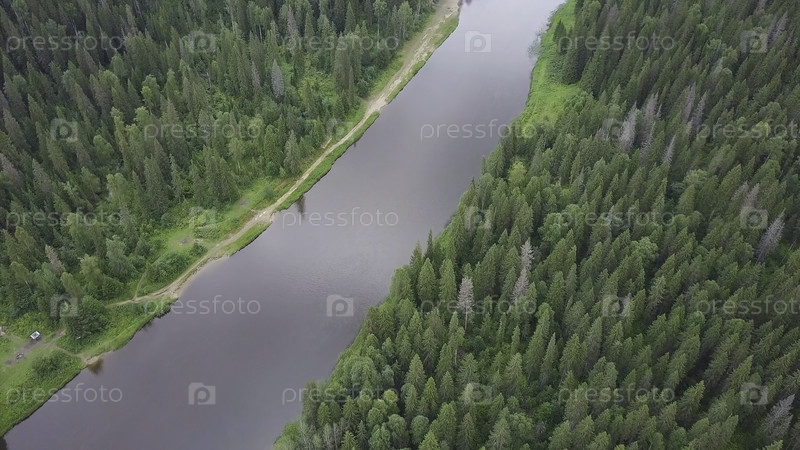Вид реки с воздуха на зеленой лесной равнине.Вид реки в летний день на фоне больших белых облаков.Крутящаяся река, потрясающий пейзаж