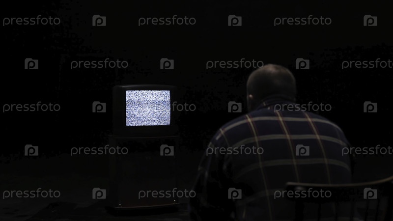 Сбой в работе телевизора.Сток.Мужчина смотрит с разбитого телевизора.Концепция одиночества
