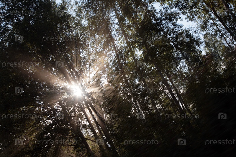 Солнце светит сквозь лиственный лес летом, разгоняя туман