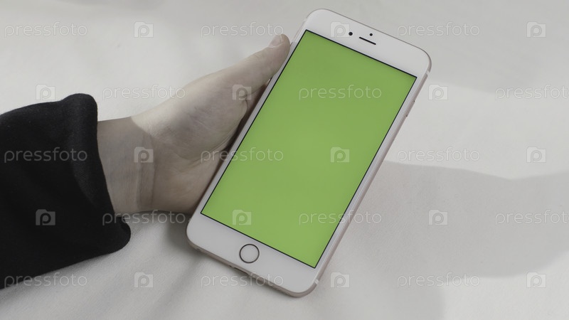 Рука, держащая зеленый смартфон с сенсорным экраном на белом фоне. резервные записи. рука со мобильным телефоном с хромовым ключом