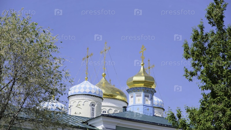 Православные кресты на золотых куполах снова сияют с чистым голубым небом. резервный кадр. красивая церковь в честь всех святых, окруженная зелеными деревьями