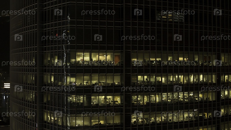 Рядом с окнами небоскреба ночью светит свет, а люди внутри - концепция ночной жизни
