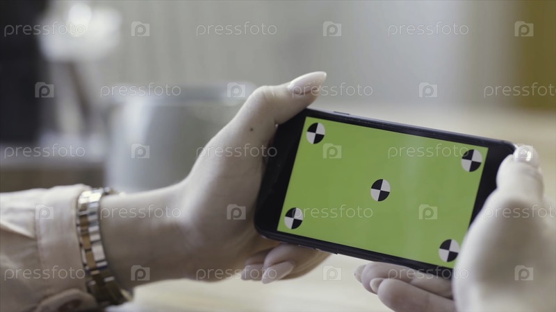 Женщина смотрит на горизонтальный смартфон с зеленым экраном Закрыть красивые женские руки, держа мобильный телефон с хромацеей на размытом фоне комнаты