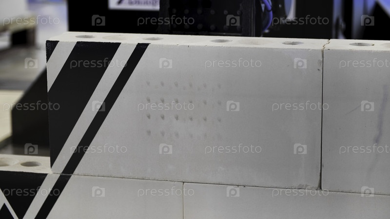 Промышленная робототехническая машина на международной промышленной выставке.Закрой робота, поместив белый кирпич в слой стены, технология для городского строительства