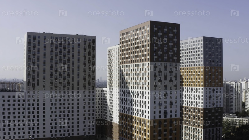 Современный жилой комплекс. Продолжайте. Аэрофотосъемка многоэтажных зданий с ярко окрашенным фасадом, концепция размещения и урбанизации