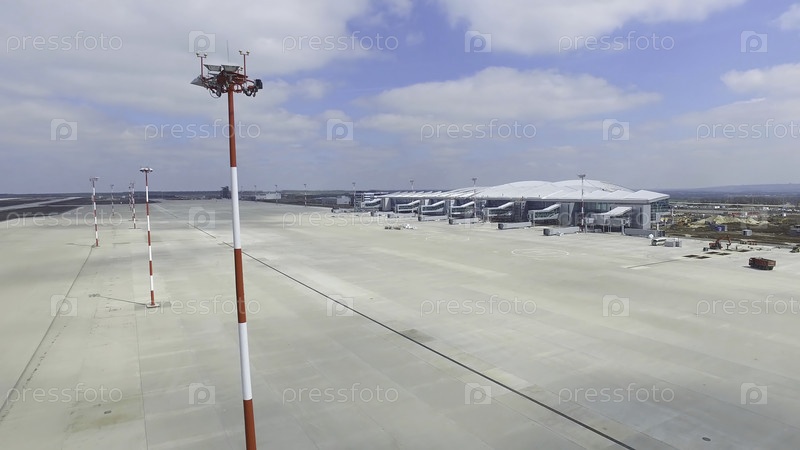 Вид из воздуха на современный терминал международного аэропорта. Путешествие по всему миру. Пустой аэропорт. Вид на взлетно-посадочную полосу в аэропорту. Маркировка аэродрома на подъездной дороге, направляющаяся к взлетно-посадочной полосе