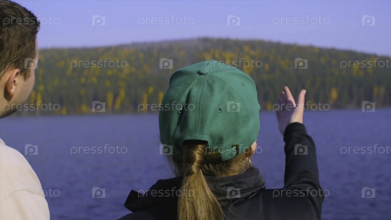 Девочка показывает озеро, лес в летний день.Девушка показывает озеро и лес, в необъятности природы вид сзади.Озеро, дерево и голубое небо
