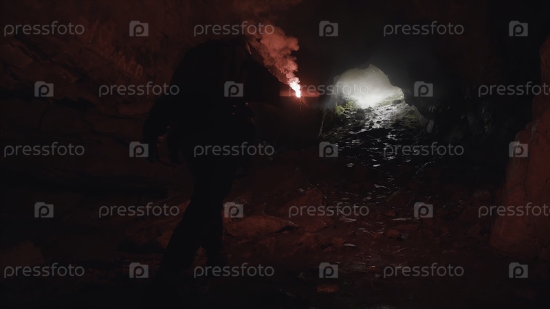 Мужчина освещает свой путь внутрь темной пещеры с горящим сигналом и оставляет за собой вход. Резервные кадры. Опасный туризм внутри тёмного пещера