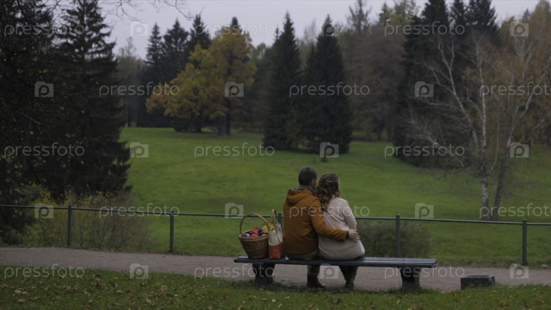 Любовная пара на скамейке.Молодая пара сидит на скамейке в парке.Разгляд сзади.Пары сидят на скамейке, размышляя о жизни.Любовь