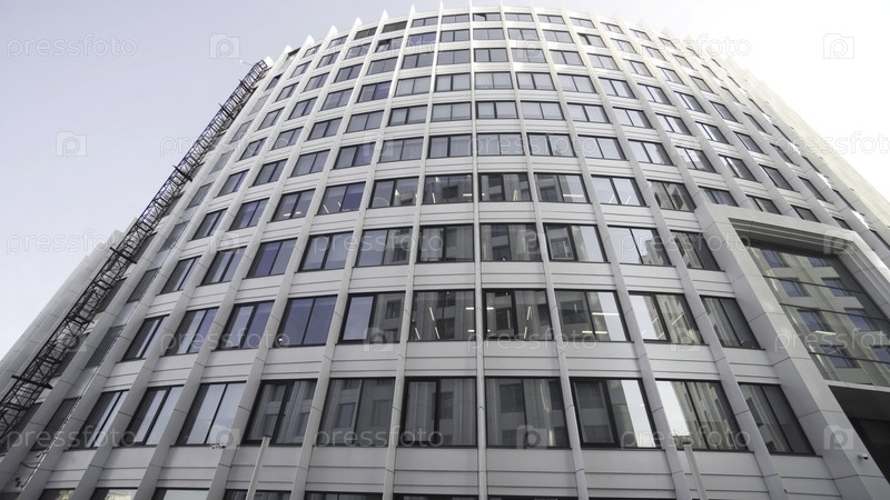 Улица с красивым современным офисным зданием со многими окнами и белым фасадом, концепция архитектуры