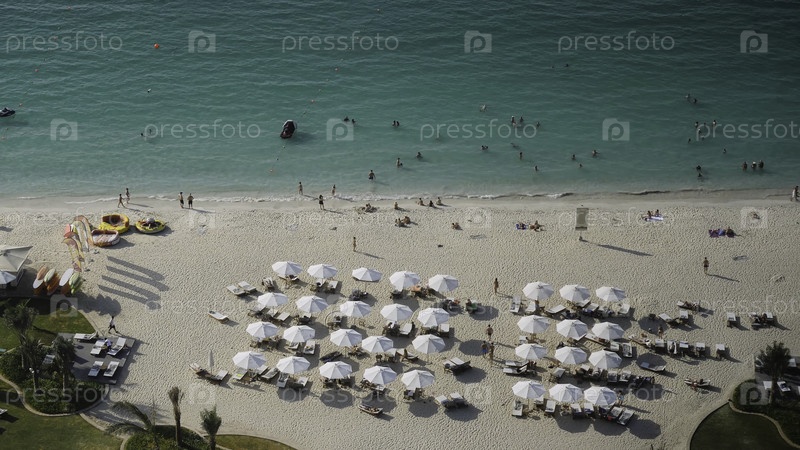 Летний пляж с людьми и бирюзовой водой океана с видом сверху.Пляж в солнечный день в Дубае Вид сверху