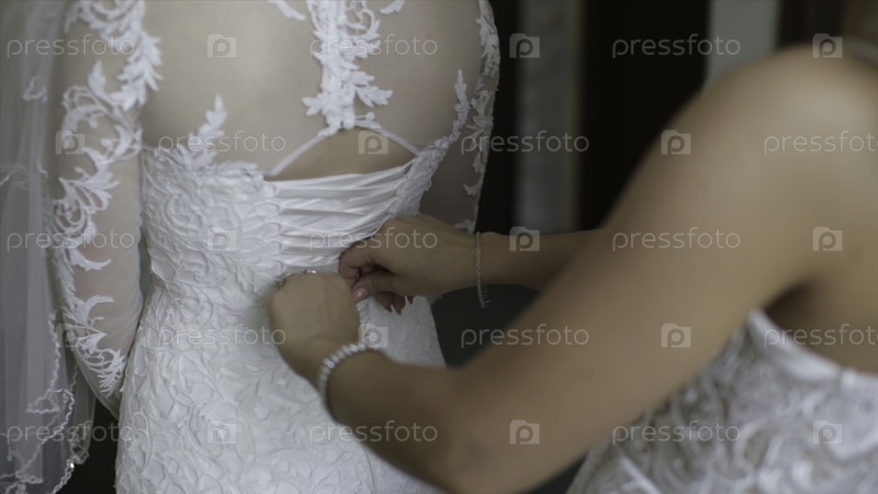 Девушка помогает невесте зашивать платье.Девочки помогают невесте нажать пуговицы