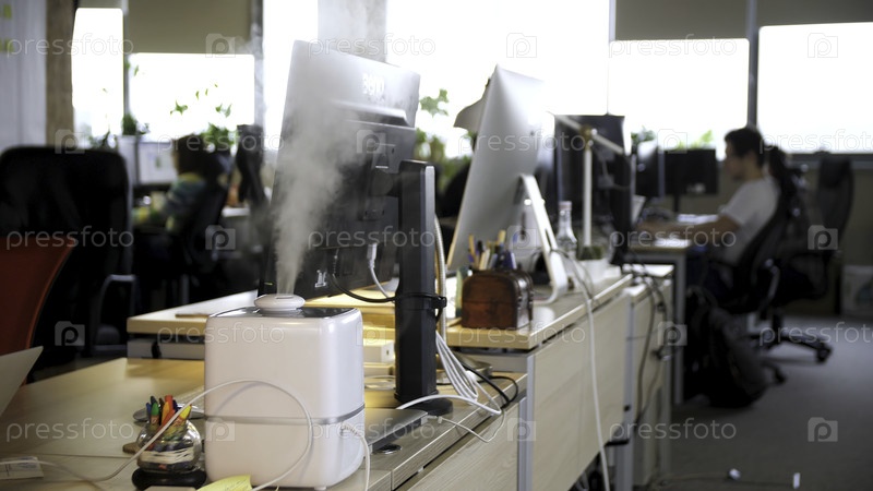 Рабочий увлажнитель на фоне молодых людей, работающих в офисе. Здоровая рабочая среда в офисе. пар из увлажнителя