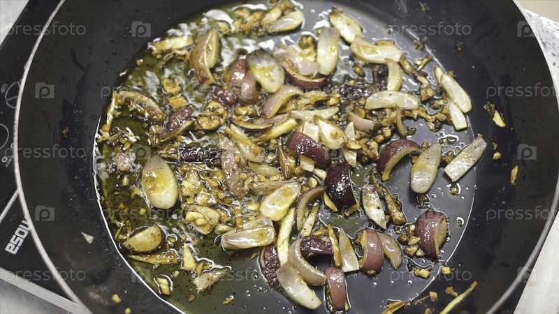 Приготовление жареных овощей в ваке. Клип. Кулинарные картофель фри нарезанный белый лук. Нарезанный на сковороде. Возвышающийся из кастрюли с жареным луком. Овощи жарить в горшке