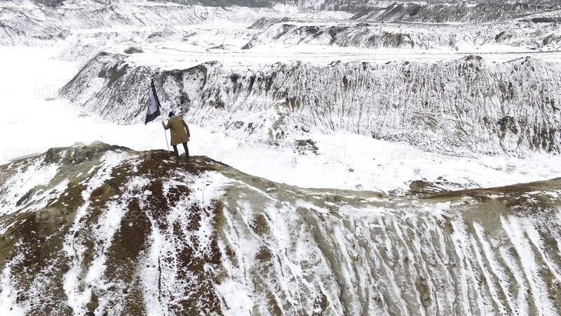 Мужчина-алпинист, путешествующий по заснеженной вершине горы на закате зимой. Видео. Воздух - Закройте взрослого альпиниста в тёплой одежде, когда вы прогуливаетесь через заснеженную горную вершину при прекрасном зимнем закате