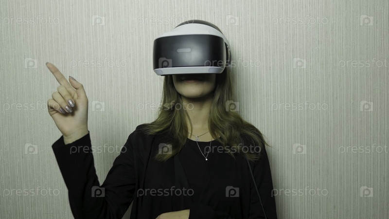 Женщина с помощью пальца прикасается к воображаемой панели и смотрит на VR-устройство против белой стены