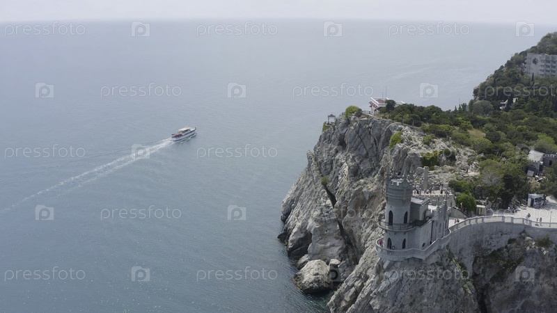 Вид сверху на замок на краю крутой скалы. Идите вперед. Красивый белый замок расположен над скалистой скалой недалеко от голубого моря. Замок Лебединого гнезда на берегу в Крыму