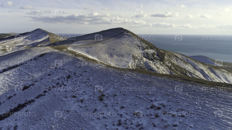 Андские горы. Долина гор со снегом сверху, вид из воздуха. Андинский хребет, Аргентина