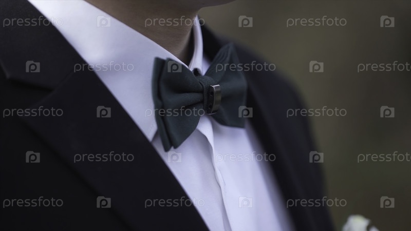 Руки мужчины касаются галстука-бабочки на костюме или смокинге