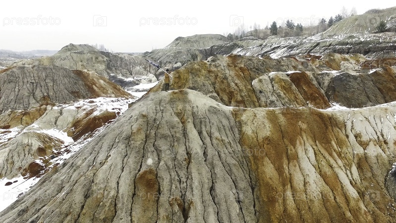Человек на вершине горы с флагом в руке. Видеозапись. Успешный силуэт победителя размахивает флагом на вершине горной вершины, взгляд из воздуха. Сзади человек ходит по скалистой горе