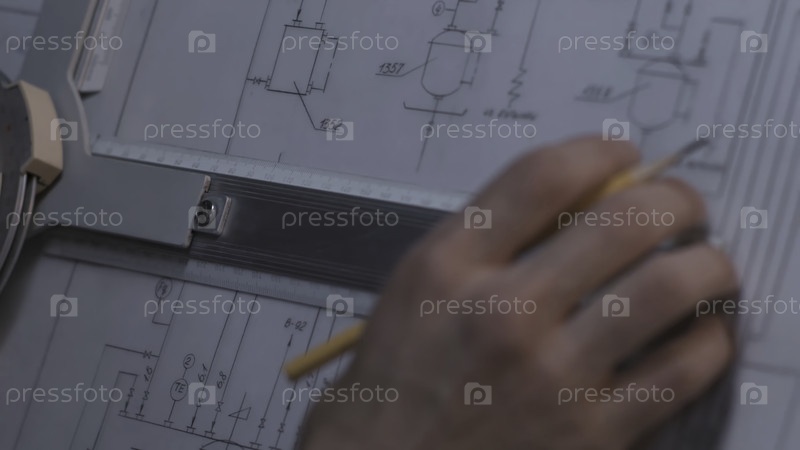 Покрывайте руку архитектора во время рисования строительного проекта на рабочем месте.Реновация дома, строительство и концепция Закройте руки мужчин путем внесения изменений в план