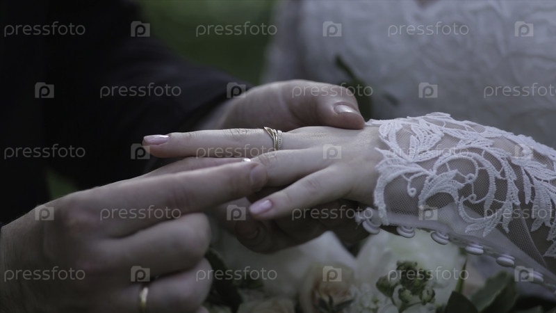 Невеста носит кольцо на пальце жениха.Жених надевает обручальное кольцо на палец невесты.Свадебные руки с кольцами.Птица носит кольцо на пальце жениха