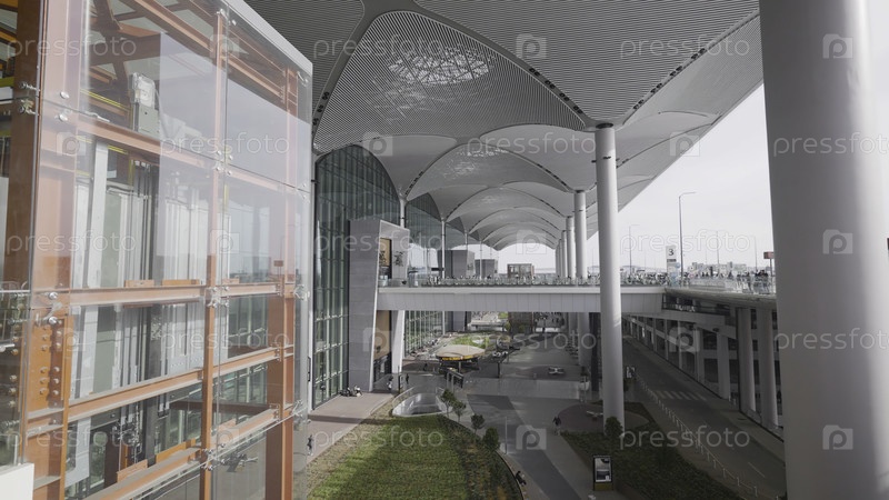 Вид на новый аэропорт Стамбула. Идите дальше. Покрытая парковка и газоны в современном здании аэропорта. Красивый экстерьер современного аэропорта в Стамбуле
