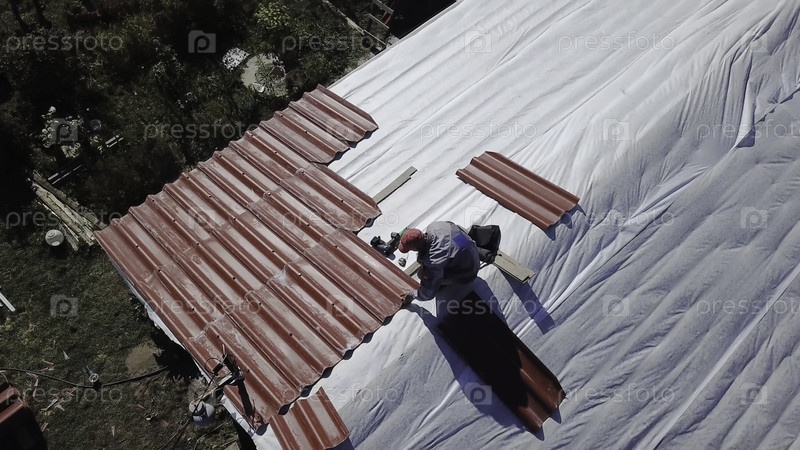 Мужчина делает крышу загородного дома. Резервные кадры. Вид сверху строителя, размещающего металлические черепицы на крыше. Человек самостоятельно устанавливает кровельное покрытие при небольшом ветре, что не очень безопасно