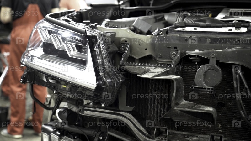 Сборка капота автомобиля на автозаводе.Продолжайте.Закрытие частей передней части машины на фоне механики в комбинезонах, собранных на современном автосборочном заводе