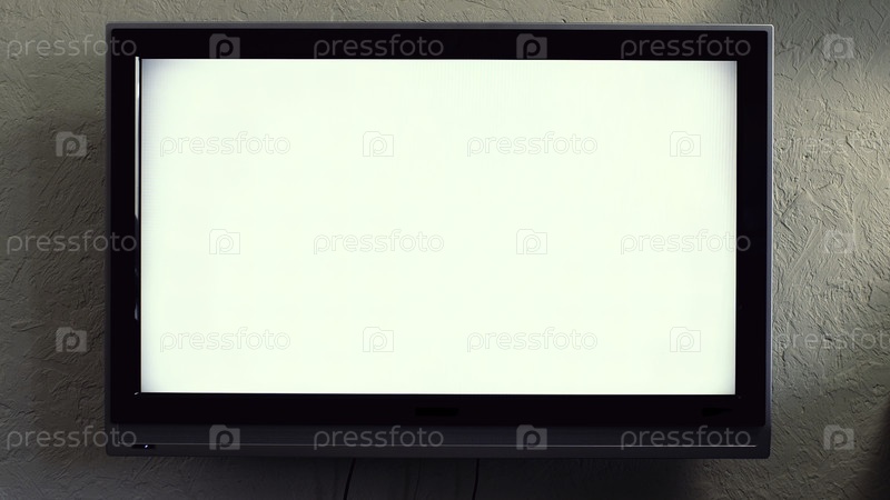 Экран телевизора на стене. Телеведущий прислонился к стенке с пустым экраном телевидения. ЖК-экран или светодиодный телевизионный экран, висящий на стене с вырезанным треком