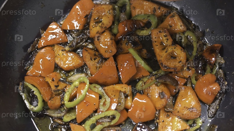 Жареный лук в масле на сковороде. Вегетарианский жареное блюдо. Здоровое питание. Вид сверху. Вид сверху, чтобы жарить овощи в ваке, на плите