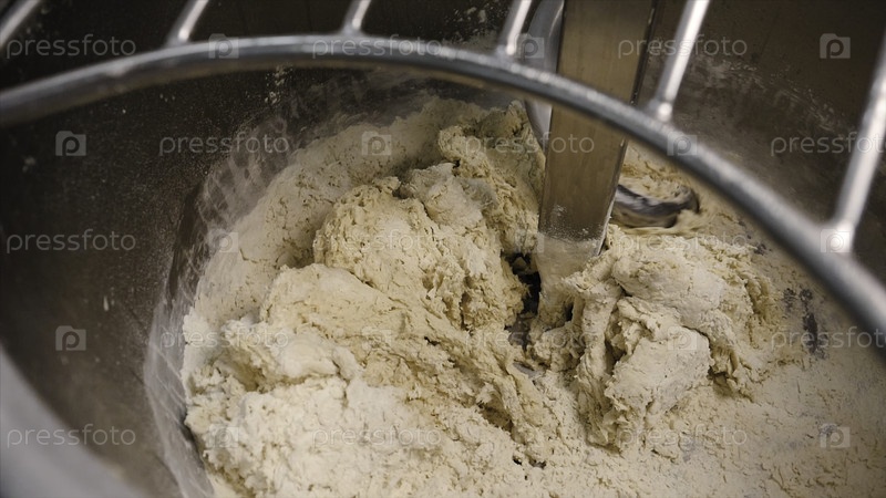 Завершение смешивания теста в производственном миксере. резервные кадры. спиральная дробилка трещины свежего тесто для выпечки на пекарне
