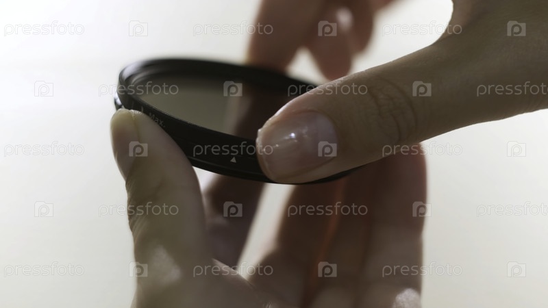 Закройте фильтр поляризующих линз в руках девочек, изолированных на белом фоне.Женщина превращается в фильтр объектива с обеих сторон