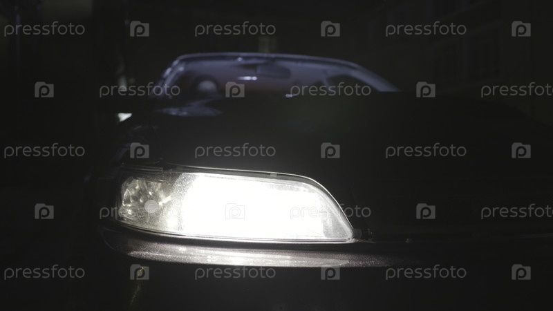 Закройте фар припаркованного автомобиля, который выключен ночью.Запчасти для автомобилей, передний бампер и фары стоящие рядом с домом