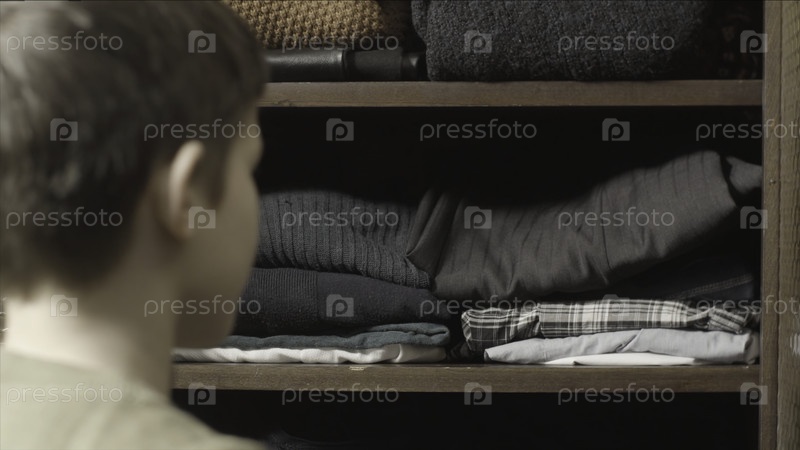 Ребёнок надевает одежду. Мальчик вынимает рубашку из шкафа. Ребенок кладет одежду в шкаф вместе с одеждой