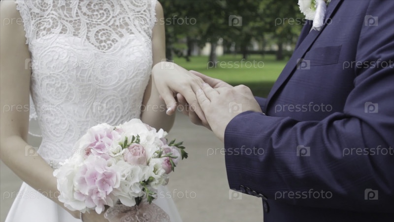 Невеста и жених ходят и держатся за руки на лугу. Широкоугольный закат солнца. Женихи гуляют вдоль реки, улыбаются и целуются. Свадебная семья, невеста, жених и их дети проходят по осеннему парку в день свадьбы