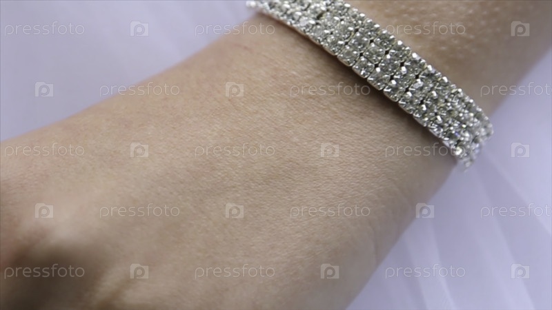 Ювелирный браслет и кольцо на руке невесты. Руки невесты с кольцом. Роскошные браслеты на руку невесты в ближайшем плане Руки невесты перед свадьбой. Свадебные аксессуары. Свадебная церемония. Ожидание свадьбы. Гусиная кожа на руке. Се