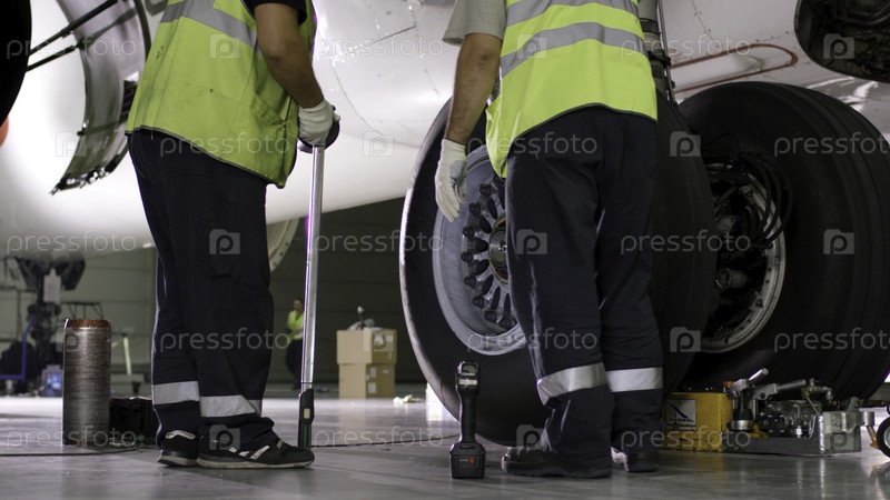 Работник аэропорта проверяет шасси. двигатель и шасси пассажирского самолета в условиях тяжелого технического обслуживания. инженер проверяет посадку и мотор самолёта